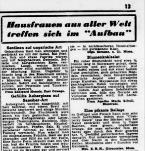 Back to the “Housewives” section that opened this essay, two of the recipes published on this particular date (Aufbau published this feature on a somewhat regular basis during the 1950s) arrived from the East Coast of the United States: one from East Orange in New Jersey and the second from Gloucester in Massachusetts. A third arrived from Montreal, Canada, while the fourth was sent from a reader who listed her residence as “currently in Nice,” Southern France. This small section thus offers an example of Aufbau’s remarkable diasporic function. Bringing readers into the homes and kitchens of these four recipe authors, the paper’s clientele could marvel at the global extent of their community in dispersal through the intimate act of sharing ideas for meals.
