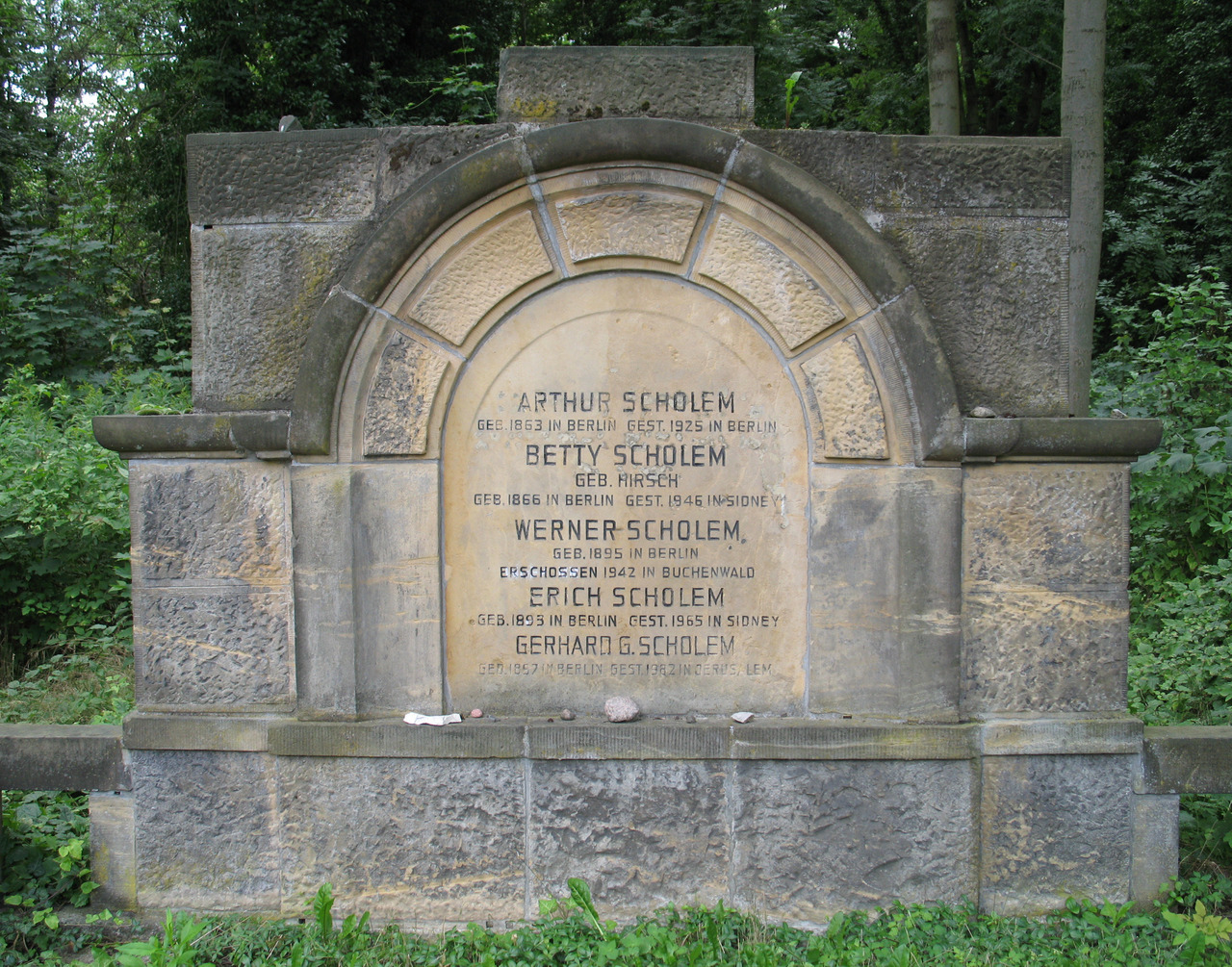 Fig. 3: The Scholem family grave at the Jewish Cemetery in Berlin-Weissensee, which implies movement within the German-Jewish diaspora that continues beyond death: between Berlin, Jerusalem, and Sydney. Reinhold, Erich, and Betty Scholem were buried in Australia, while Gershom Scholem’s grave is located in Israel. Werner Scholem perished in the Shoah, and only their father, Arthur Scholem, is known to be buried in Berlin. Photo by Jay Howard Geller, 2009.