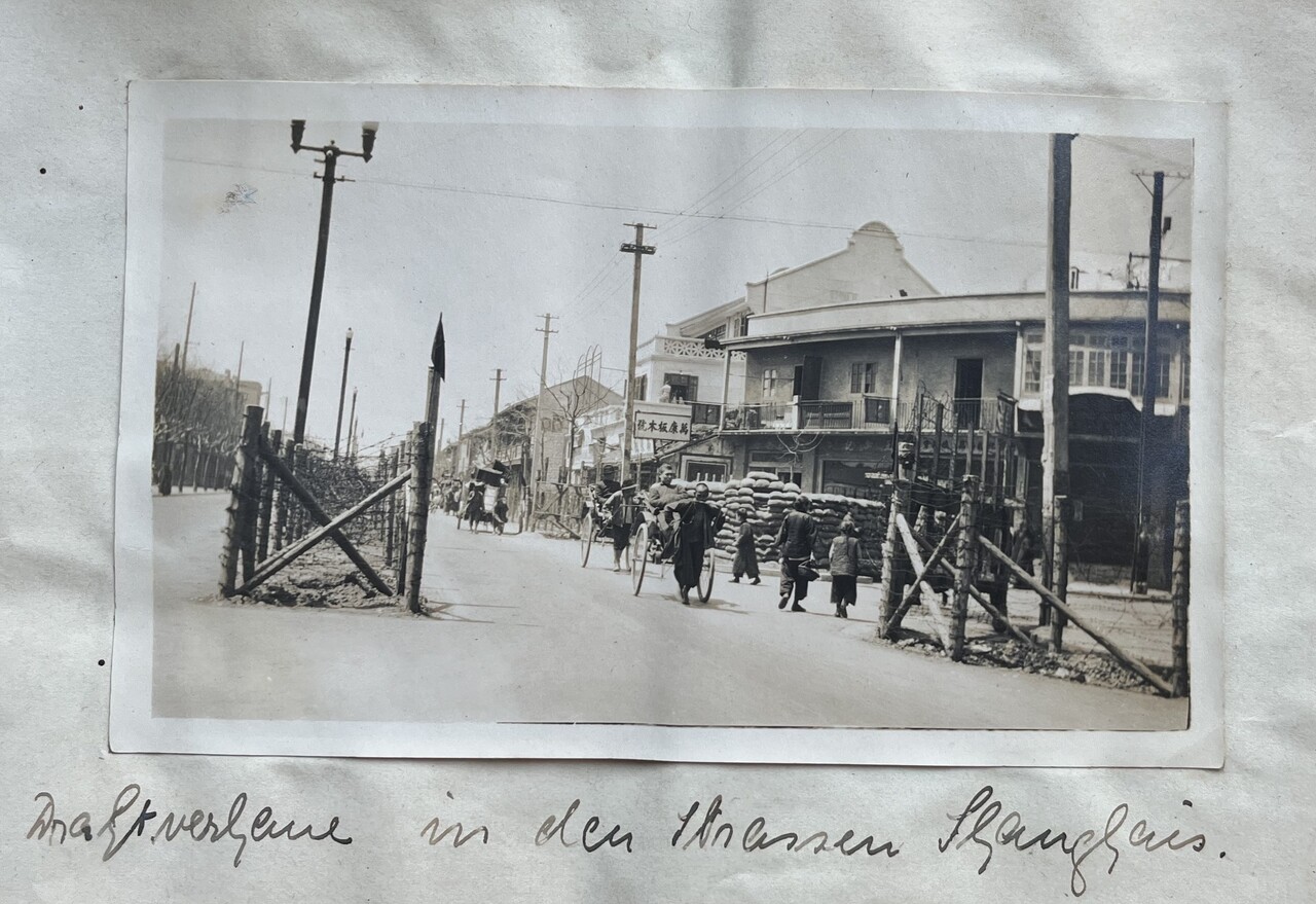 Fig. 4: Barbed-wire barricades and sandbags in Shanghai, c. 1937. Photograph by Suse Schauss titled “Drahtverhaue in den Strassen Shanghais” (Barbed Wire in the Streets of Shanghai). Private collection Sonja Mühlberger.