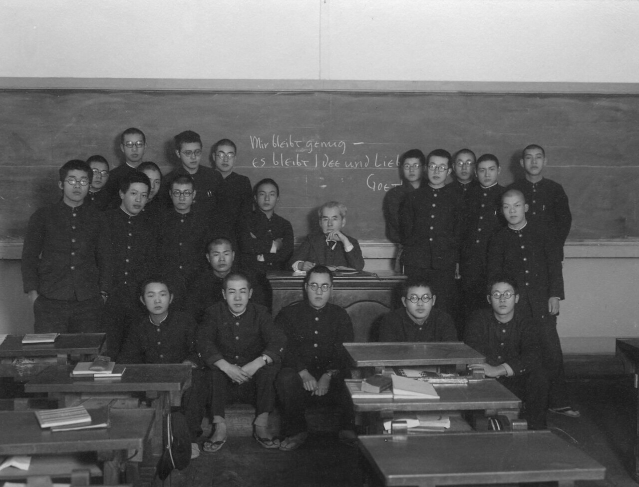 Fig. 6: Kurt Singer with his students in Sendai, 1938. The group photograph was taken on his last day of class. A Goethe quotation on the blackboard translates to “I have enough yet – love remains, and the idea!”; Tohoku University Archives/Tōhoku daigaku shiryōkan shosai.