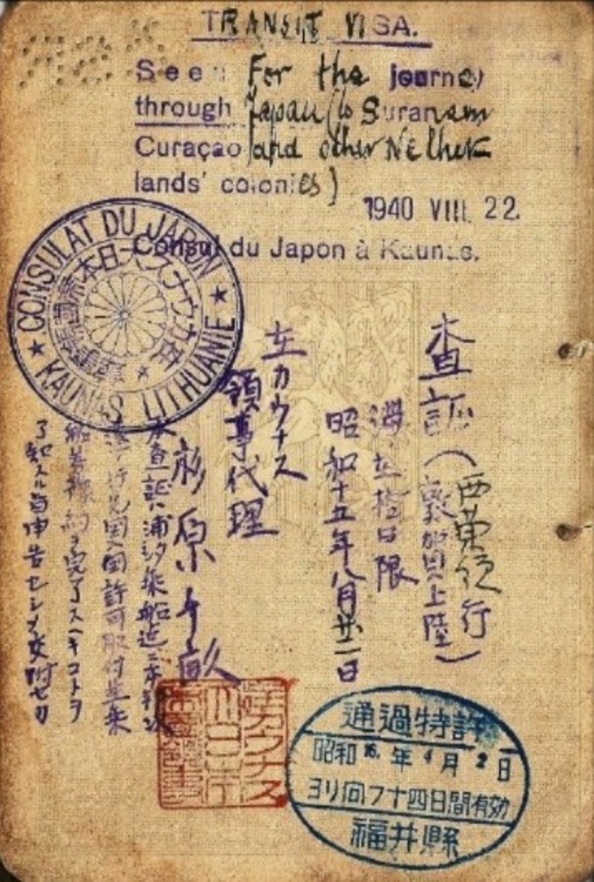 Fig. 8: Transit visa issued by Sugihara Chiune, 1940. Its holder had fled from Czechoslovakia through Poland to Lithuania. The visa permitted onward travel to Dutch colonies, including Suriname and Curaçao. Creative Commons license, Sugihara visa - File:Sugihara visa.jpg - Wikimedia Commons