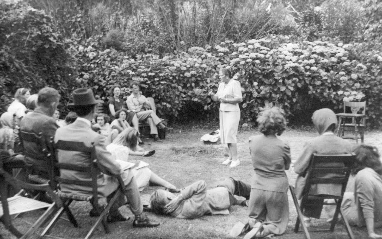 Fig. 5: Actress Maria Dronke with participants of the Wallis House Residential Drama School, 1948; private archive, Monica Tempian.
