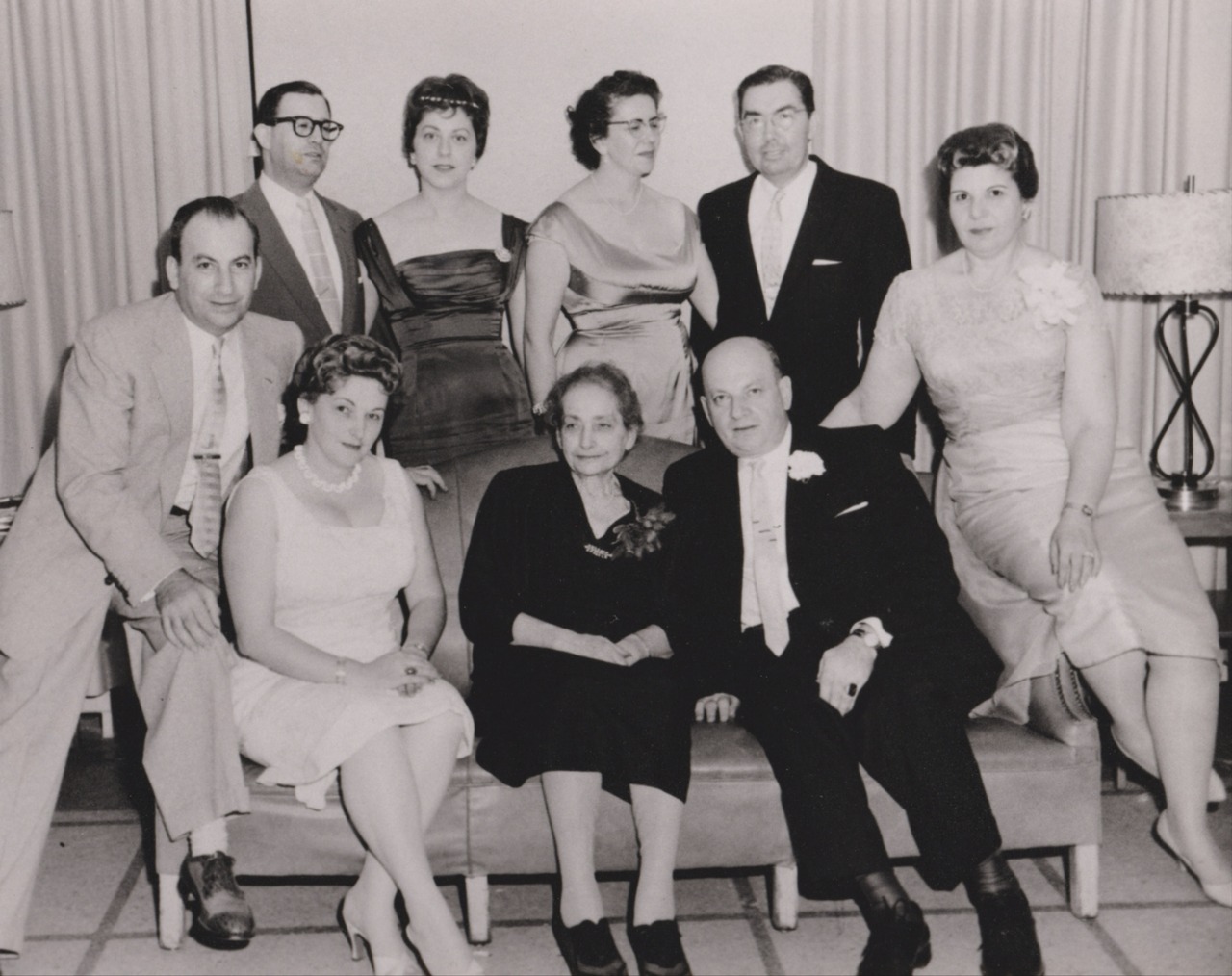 Fig. 1: Photo of the reunited Katzenstein family in Chicago, 1958 (back row, left to right): Rabbi Albert H. Ellison and his wife, Irmgard Ellison, born Katzenstein, Ruth Heilbrunn, born Katzenstein, and her husband, Leo Heilbrunn; (bottom row, left to right): Harry (Hans) Katz and his wife Eleanor (Gisella) Katz, Toni Katzenstein, Alfred (Al) Katz and his wife Jeanette (Jean) Katz; private archive Rayna Ellison Zussman.