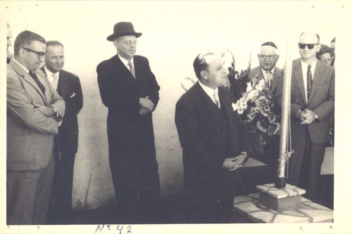 Fig. 2: Walter Lubasch (fourth from left), one of the driving forces behind the school’s founding, speaking at its inauguration in 1961, surrounded by other members of the founding community, including Alfredo Weil (far left); Family Archive Lubasch.