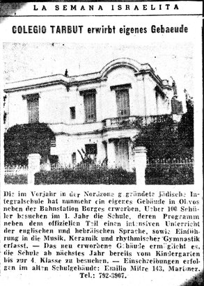 The source is a short newspaper article titled “Colegio Tarbut erwirbt eigenes Gebäude” (“Colegio Tarbut Acquires Its Own Building”), published in 1961 in Jüdische Wochenschau / La Semana Israelita, the main German-language periodical for the Jewish immigrant community in Argentina. Illustrated with a photograph of the new building, the article announces that Colegio Tarbut (Tarbut School, hereafter referred to as Tarbut), a recently founded integrative Jewish school in the northern zone of Buenos Aires, had acquired its own building in Olivos, near the Borges train station. It reports that more than 100 students were already enrolled and outlines the school’s curriculum, which combined official Argentine subjects with intensive instruction in Hebrew and English, along with music, ceramics, and rhythmic gymnastics. It also mentions that starting the next academic year, the school would expand to include students from kindergarten through fourth grade. Enrollments were to be completed at the school’s previous location on Emilio Mitre 143 in Martínez.